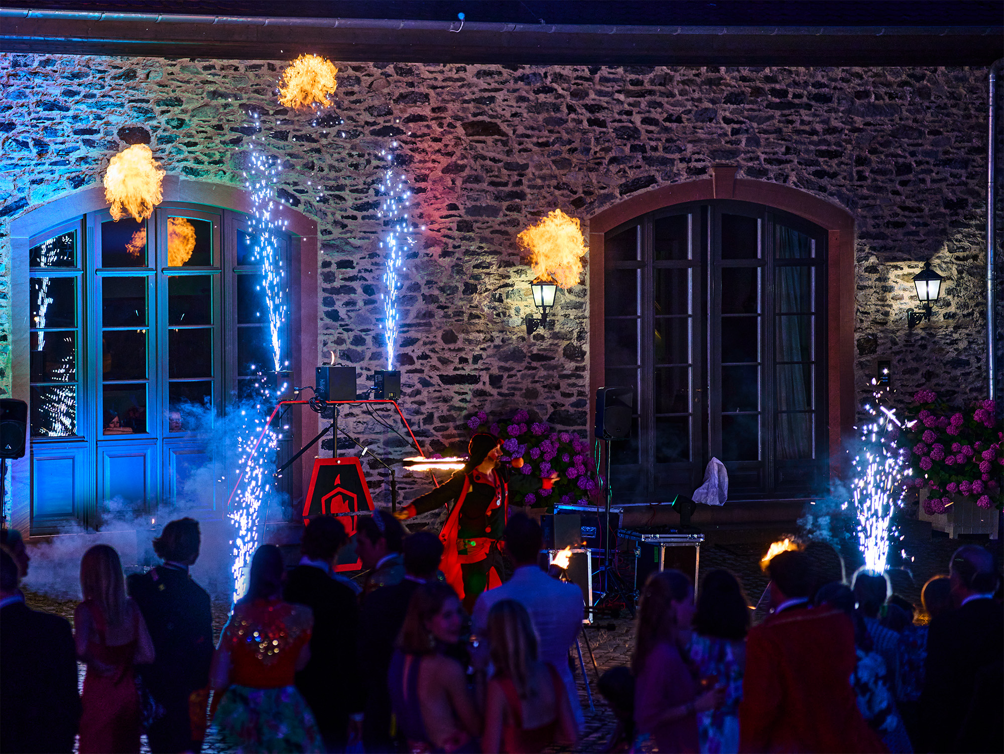 Meine Feuershows sind ein Premiumprodukt – zuverlässig, professionell und individuell abgestimmt auf Ihr Event. Ob romantische Hochzeit, exklusive Gala oder energiegeladene Firmenfeier: Jede Show wird mit modernster Licht-, Ton- und Flammentechnik realisiert. Als Full-Service-Anbieter übernehme ich alle technischen Details – von Aufbau bis Durchführung – und garantiere ein sicheres, hochwertiges Entertainment, das begeistert und bewegt.
