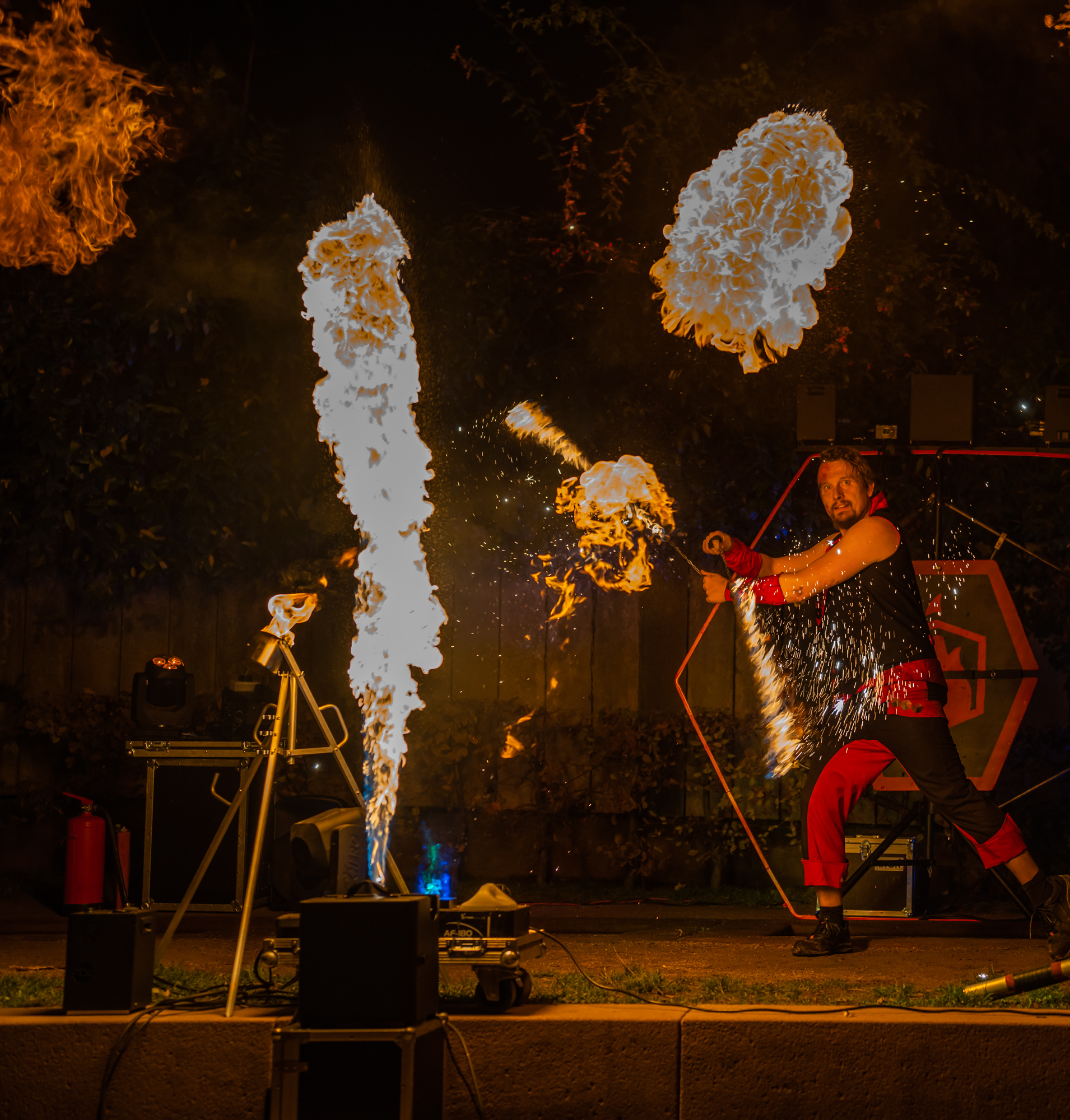 Hier finden Sie Fotos von echten Aufführungen meiner Feuershows. Sie zeigen authentische Szenen, wie sie live auf der Bühne stattfinden – ohne Inszenierung oder Studioeffekte. So bekommen Sie einen realistischen Eindruck meiner Show, der Energie, Atmosphäre und die Faszination des Feuers in seiner vollen Intensität widerspiegelt.