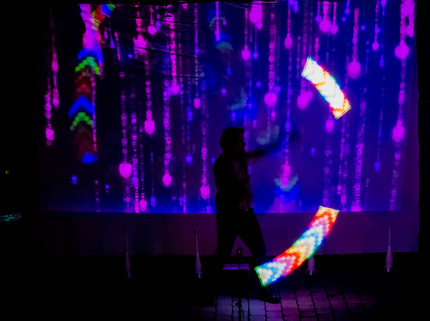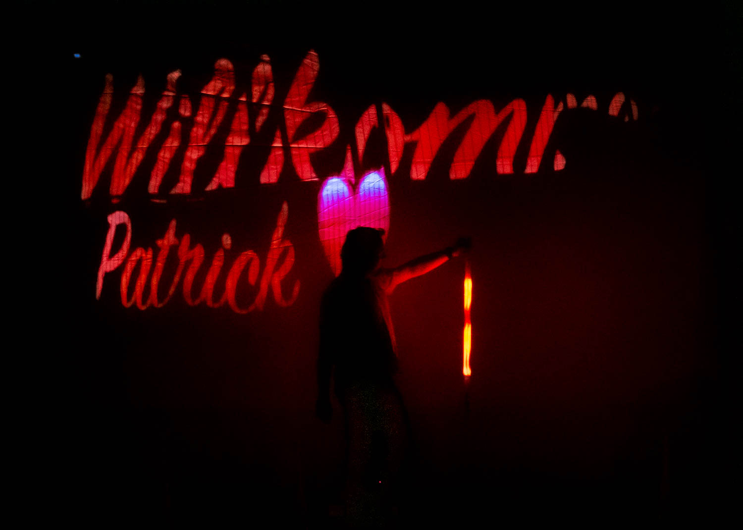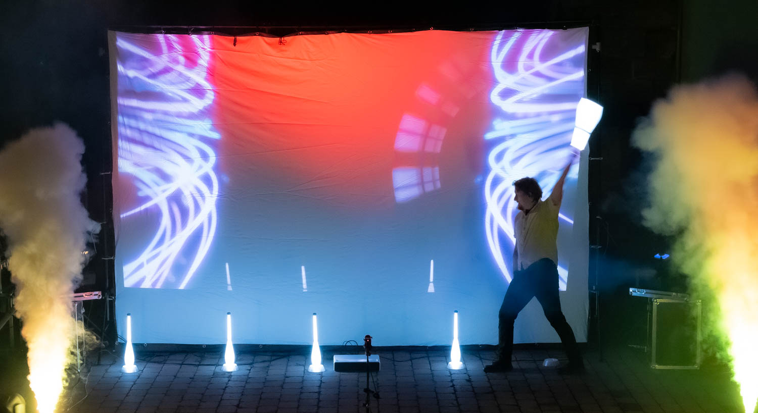 Als die Musik begann, tanzten Lichter im Rhythmus. Ihre Namen erschienen in der Luft, begleitet von leuchtenden Herzen und sanften Farben. Aus den Bewegungen meiner Requisiten entstanden schwebende Bilder – eine Geschichte aus Licht, erzählt für zwei Menschen, die sich gefunden haben. Auf der Leinwand leuchteten Fotos des Paares auf, verbunden mit Symbolen ihrer gemeinsamen Erlebnisse. Der Moment war still und intensiv. Ich sah, wie die Braut lächelte – und dann Tränen der Rührung flossen.