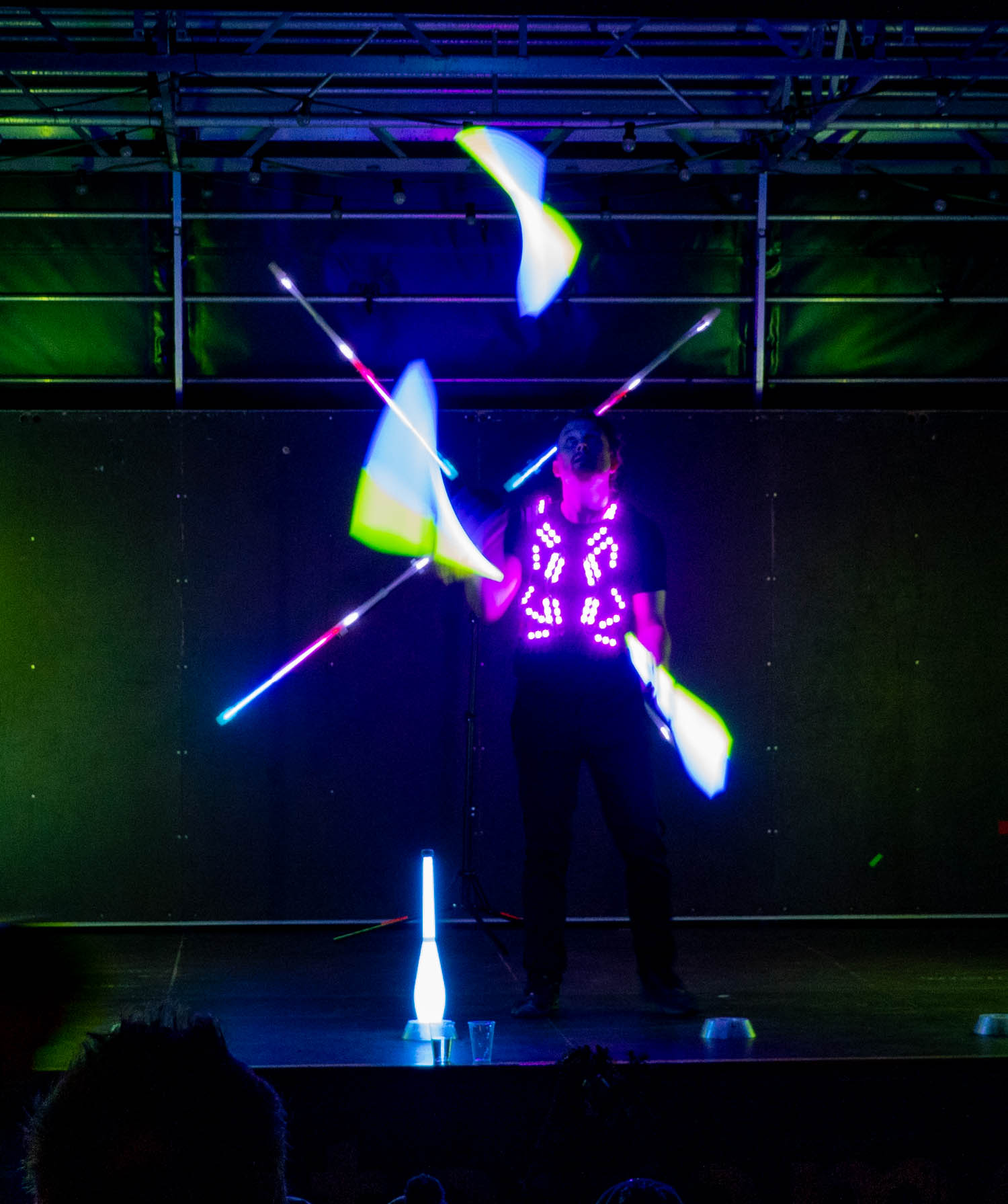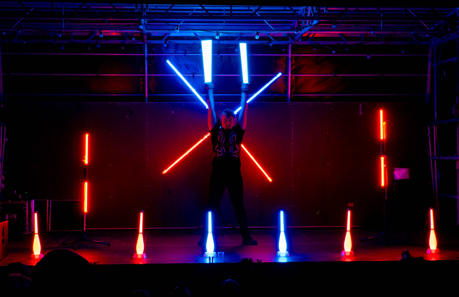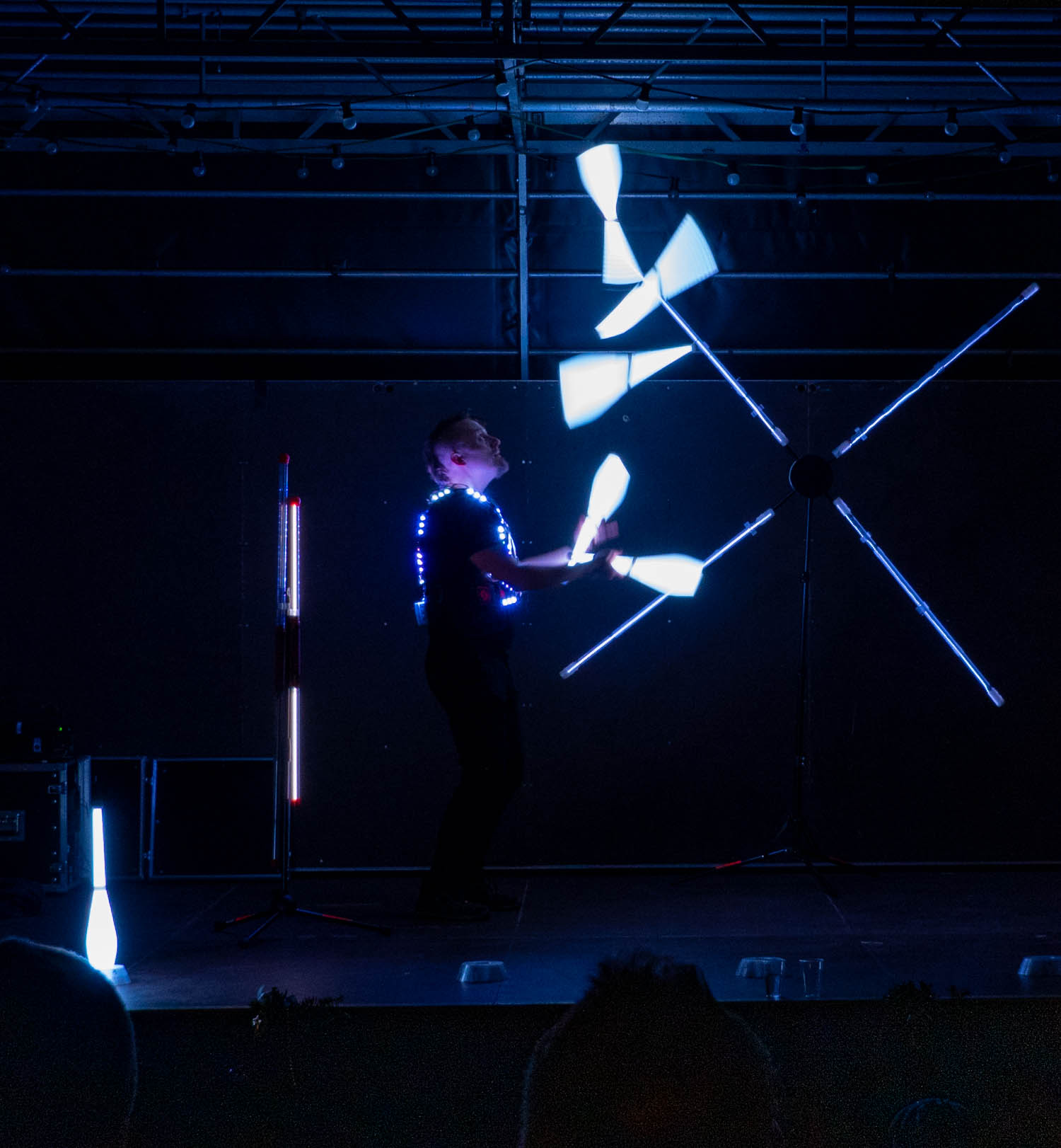 Mit präziser Jonglage und programmierter Lichttechnik erschuf ich Bilder, die sich im Takt der Musik wandelten. Die LED-Requisiten ließen den Platz erstrahlen und verwandelten die Bühne in ein farbenfrohes Schauspiel. Als die Dunkelheit hereinbrach, entfaltete die Show ihre ganze Wirkung – das leuchtende Spektakel fügte sich perfekt in das warme Lichtermeer der Buden ein und zog Besucher aus allen Richtungen an.