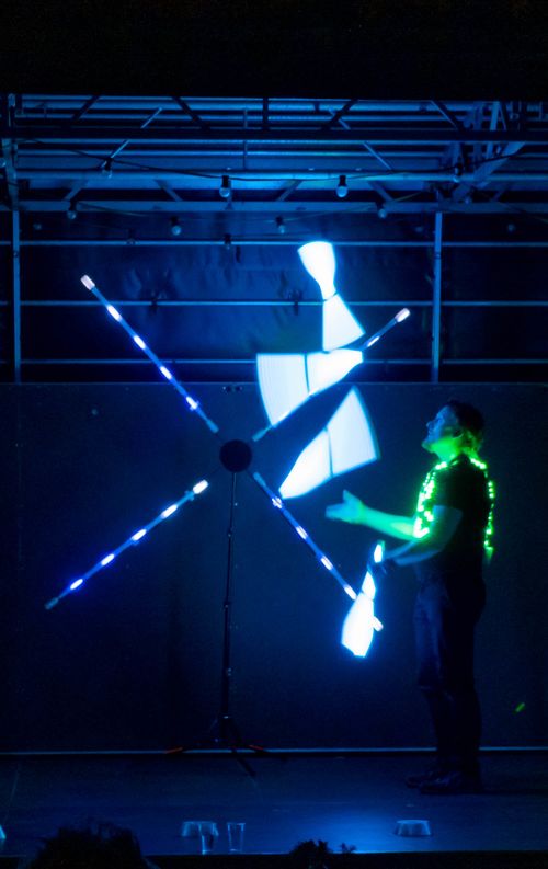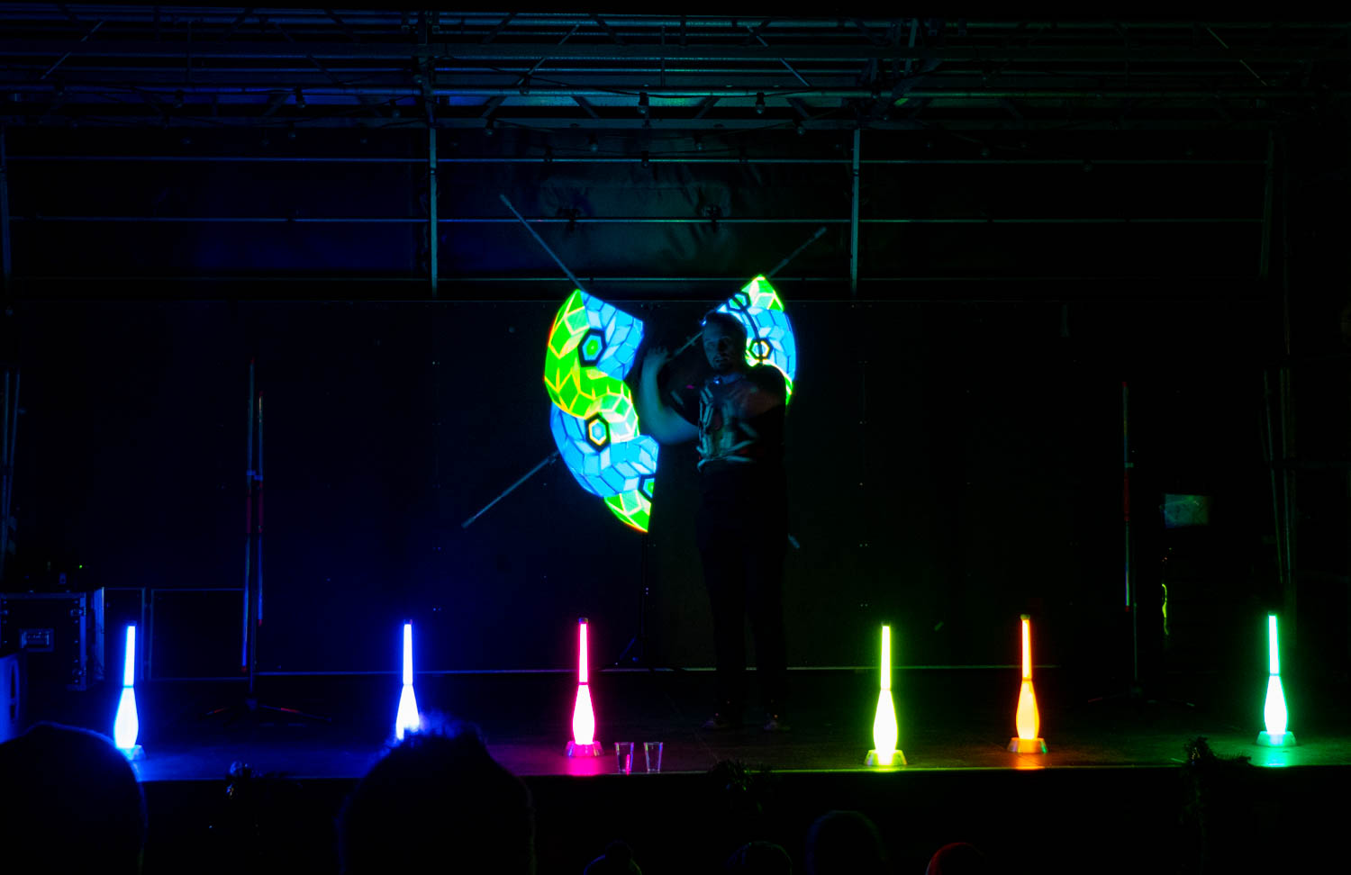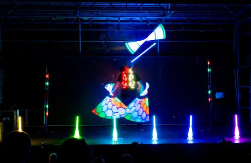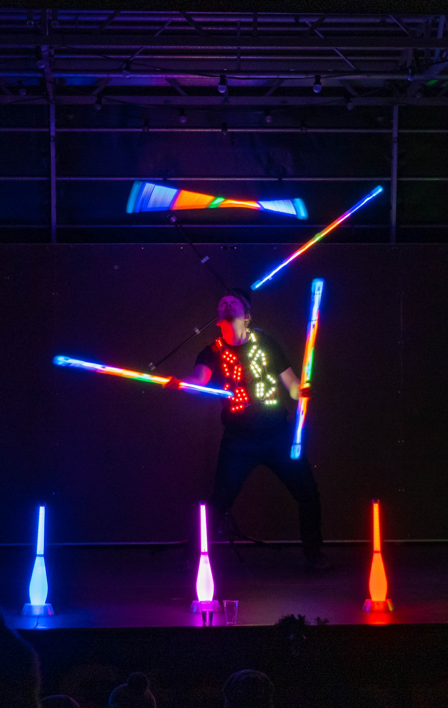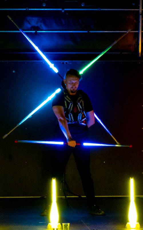 Mit präziser Jonglage und programmierter Lichttechnik erschuf ich Bilder, die sich im Takt der Musik wandelten. Die LED-Requisiten ließen den Platz erstrahlen und verwandelten die Bühne in ein farbenfrohes Schauspiel. Als die Dunkelheit hereinbrach, entfaltete die Show ihre ganze Wirkung – das leuchtende Spektakel fügte sich perfekt in das warme Lichtermeer der Buden ein und zog Besucher aus allen Richtungen an.